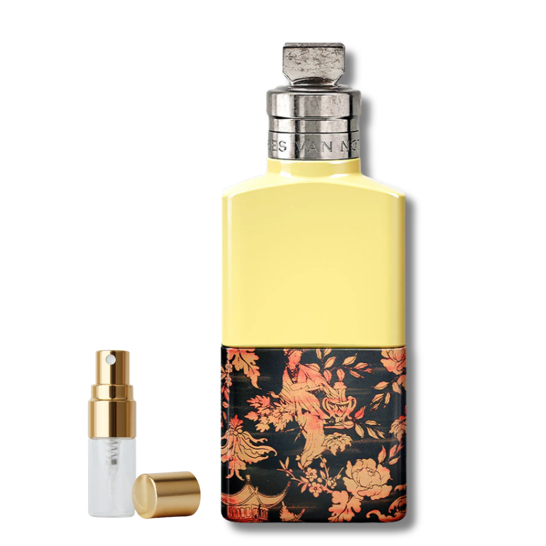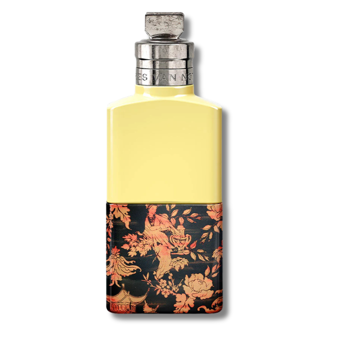 The bottle pairs sleek, glossy pop-yellow glass with a decorative motif inspired by intricate Asian lacquer craftsmanship, capturing the dialogue between heritage and modern design. Made with 90% naturally derived ingredients.